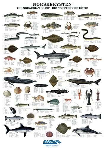 Ideel til dekor. Plakat med 59 av norskekystens vanligste sjømat og to hvaler. Fiskene er illustrert av Bente Olesen Nyström, Susanne Weitemeyer og Carl Christian Tofte.