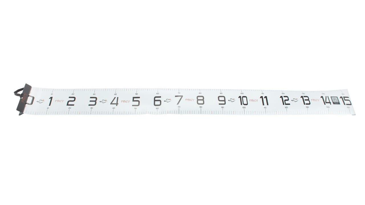 Prey sitt målebånd er laget for at du skal kunne måle fangsten din på en sikker og nøyaktig måte. Båndet er hele 25 centimeter bredt og 150 centimeter langt. Det er laget i solid seilduk, og er utstyrt med en høy kant i hardplast ved en-centimetersmerket. Her plasseres snuten på fisken du skal måle. Båndet kan enkelt rulles sammen og låses i sammenrullet forfatning med borrelåsen ved 150-centimtersmerket. Prey-målebåndet er ellers utstyrt med en QR-kode som leder deg rett til en artikkel med info om både minstemål, rødlister og fredninger av norske fiskearter. Stadig flere fiskekonkurranser fokuserer nå på centimeter fremfor kilo, så et godt målebånd er et must for alle konkurranseglade fiskere. Det kan også være nyttig å vite hvor lang fisken du får er, både med tanke på minstemål og for egenstatistikken sin del.