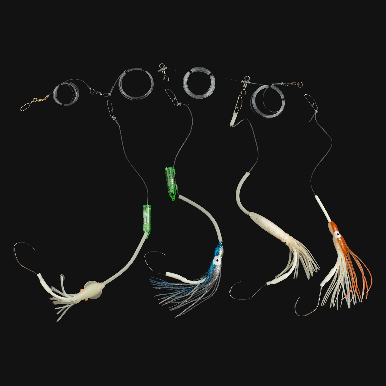 Her er havfiskeriggen som gir deg mange valg. Hovedsnøret er utstyrt med to kraftige svirvler med 2,5 meters mellomrom, og med i pakken følger det fire forskjellige opphengere slik at du selv kan avgjøre hva du vil fiske med fra tur til tur. Dette er et allround paternoster som kan brukes til mange forskjellige arter, men opphengerne som følger med er beregnet på storfisk. Fileter av sild, makrell eller sei funker ypperlig som agn til disse. Husk å bruke elastisk surretråd for å få agnet til å sitte bedre.