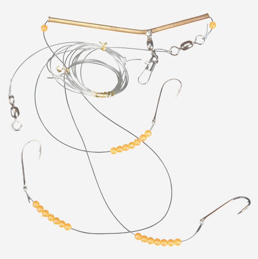 Takkel med dobbeltslep, glidebom og en opphenger. Laget for driftfiske fra båt, der to agn fiskes helt nede ved bunnen, mens det tredje svevet litt over. Krokstørrelse 1/O. Gjennomsiktige perler som attraktor.