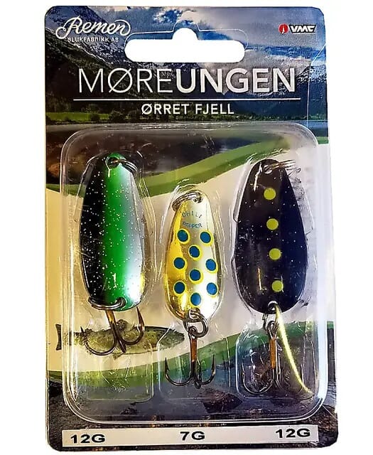 Remen Møreungen Ørret Fjell sluksett er en 3-pack med Møreungen beregnet på fjellvann der du fisker etter ørret. Den lille vippen foran gir Møreungen den livlige gangen som lokker fisken til hugg, og bestselgeren har mang en ørret og røye på samvittigheten.