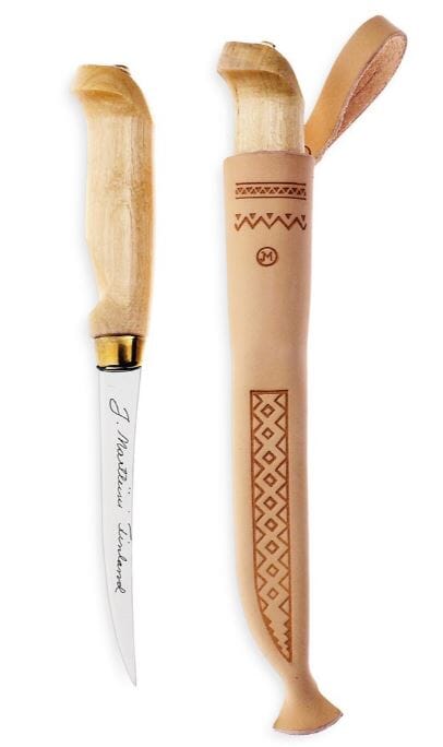 Håndtaket er laget av varmebehandlet finsk bjørk, og er behandlet med naturlig voks som beskytter mot fukt og slitasje. Det klassiske designet gir et sikkert og komfortabelt grep, og passer like godt i erfarne fiskerhender som hos nybegynnere. Med sin glatte, men solide overflate føles kniven stabil, selv når den er våt.