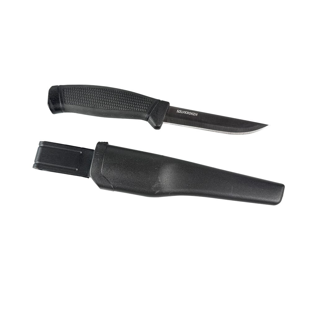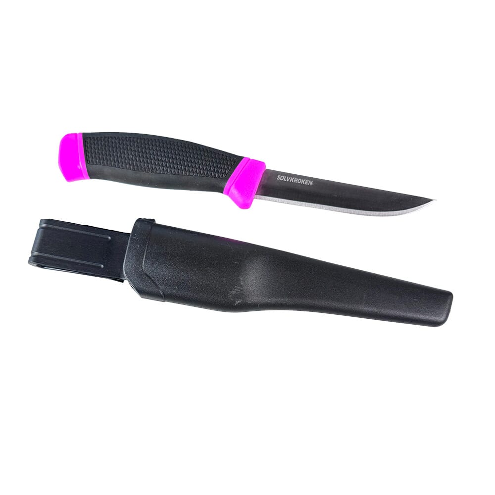Fin allroundkniv med blad i rustfritt stål og solid gummihåndtak. Kniven kommer i en solid slire med praktisk belteklips.