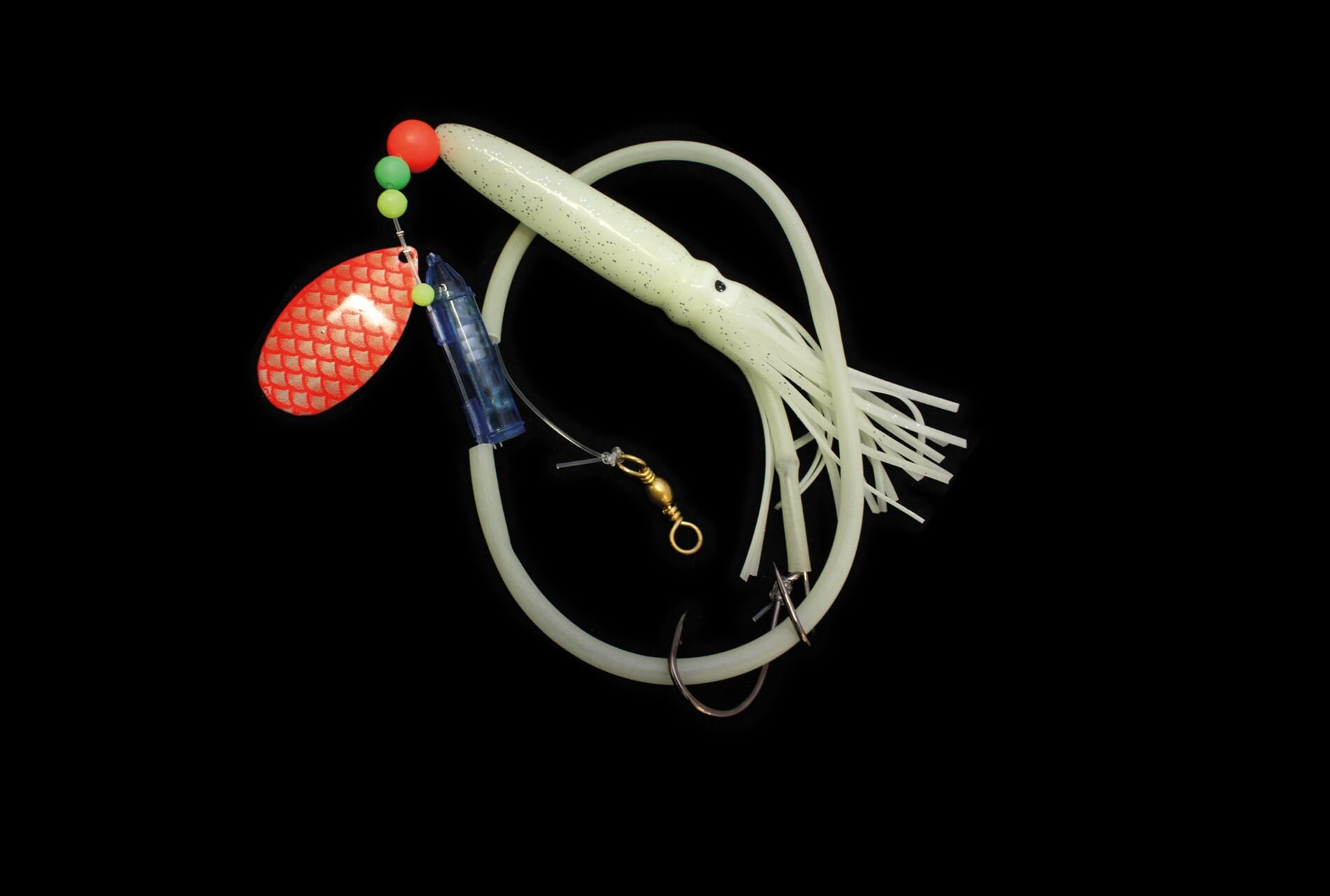 Solid havfiskeslep rigget med 2 enkeltkroker for bedre kroking. Waterlight og selvlysende blekksprut med flyteelement. Lokker til seg all storfisk som befinner seg i havet og har småfisk på menyen. Brukes med havfiskebom. L. 75 cm/Ø. 1,0 mm/Krok #11/0 + #9/0.