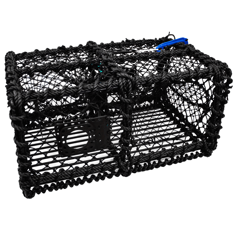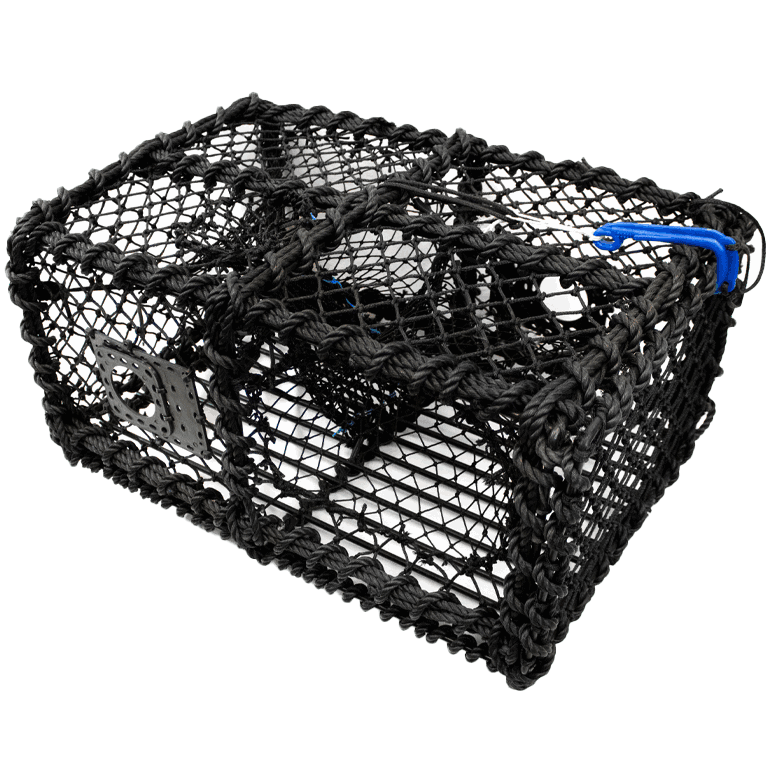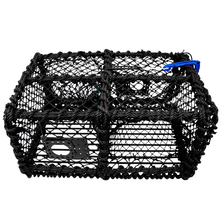 Krabbe- og hummerteine med flat topp. Den flate toppen gjør det praktisk å stable teinen i båt/nøst. Tillaget med råtnetråd. Med tausurring/beskyttelsestau. Agnpose med lukking i toppen. Åpning i enden. 2 fluktåpninger, 60/80mm. Enkle å stable, fisker godt og er plasseffektive.